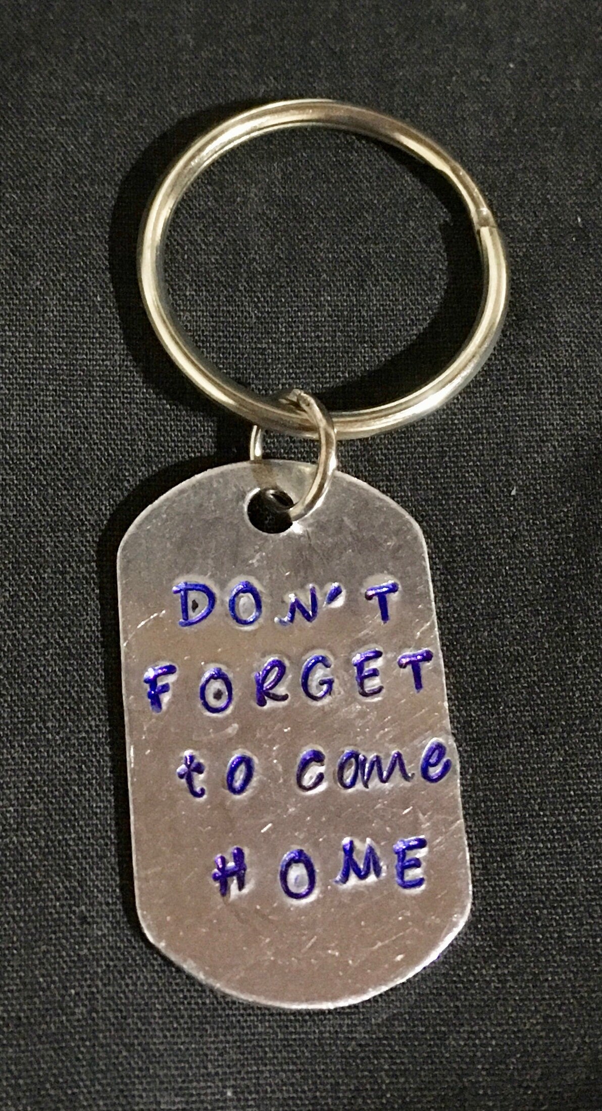 Each keychain is handmade just for you, so no two are exactly the same. The stamping will not always be perfectly aligned and some letters may strike deeper than others. This gives the piece character and makes it uniquely yours.