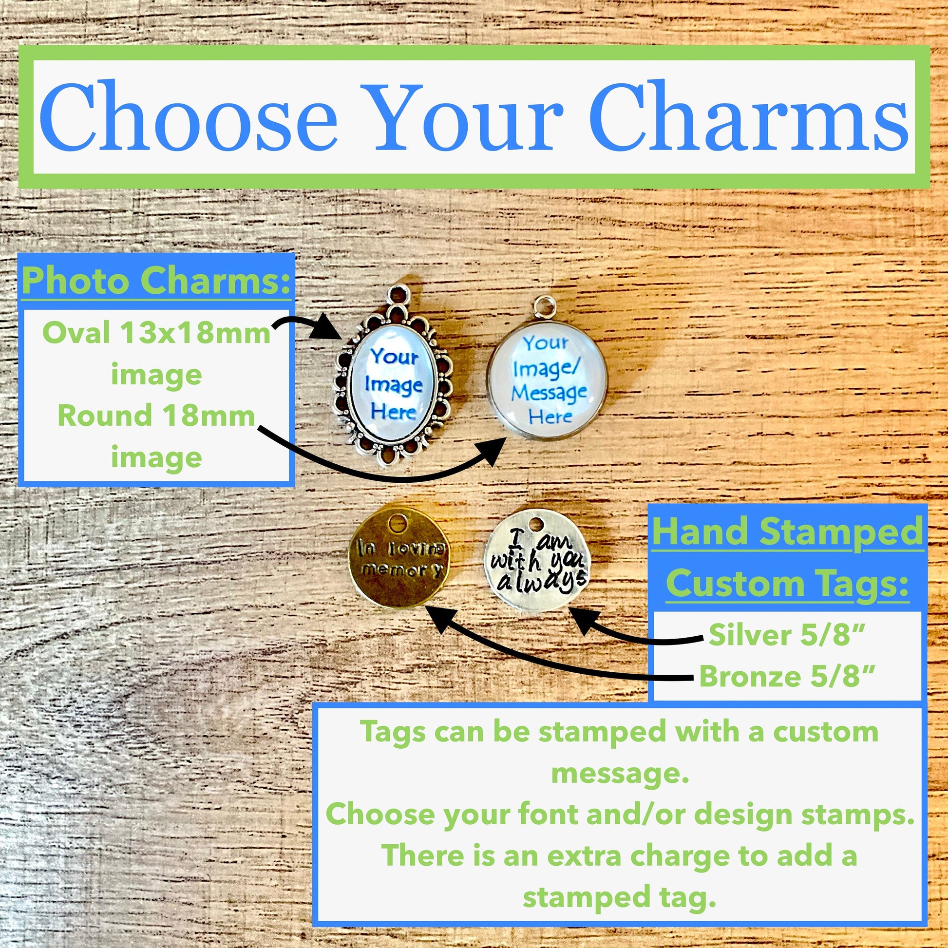 Customize your photo charm with a photo, picture, word, phrase, verse, name, date, etc. Upload an image or I can help with the design. Attach your photo/design in a message to me as a jpg or png during checkout. Be sure the image is uncropped and zoomed out enough that it will fit in the oval or circle shape of the charm. Please message me if you have questions. I will email you a proof for your approval to the address you provide during checkout.