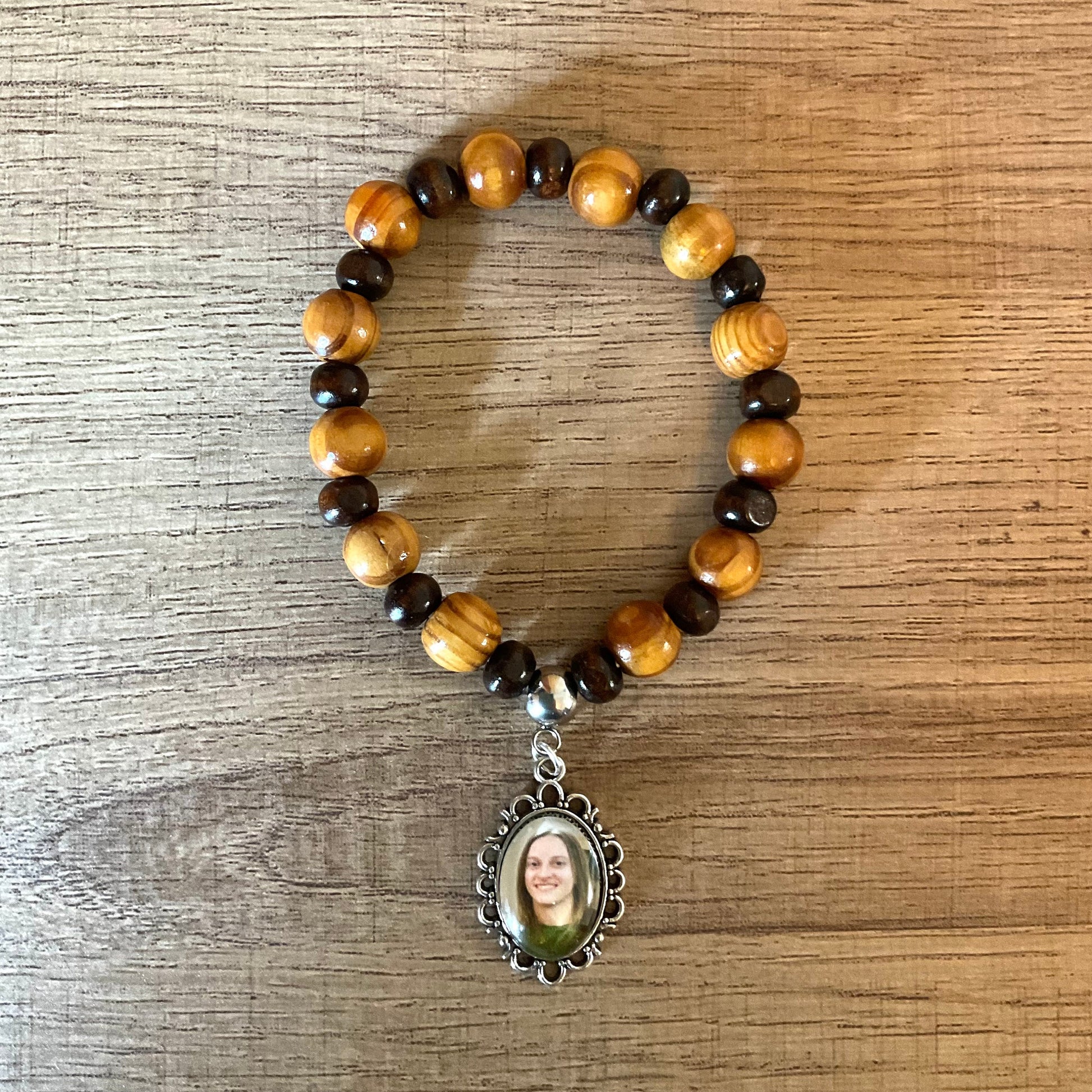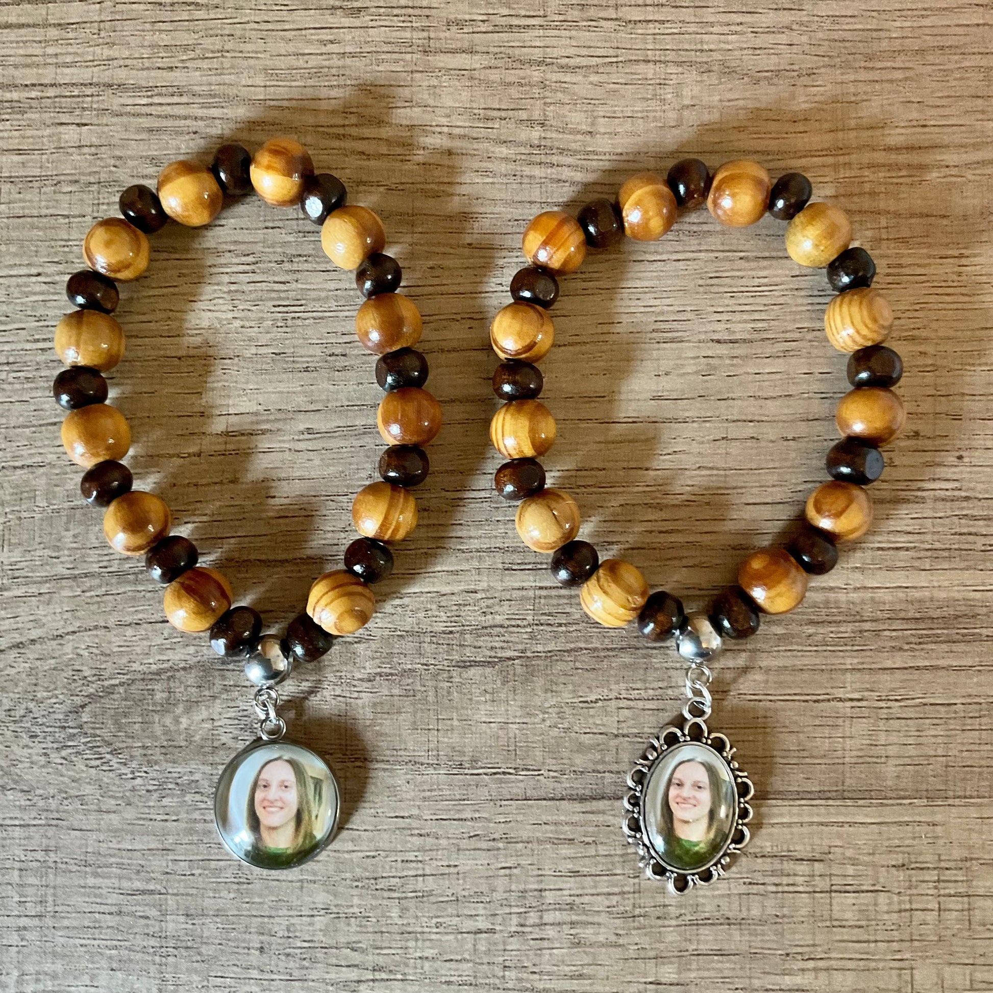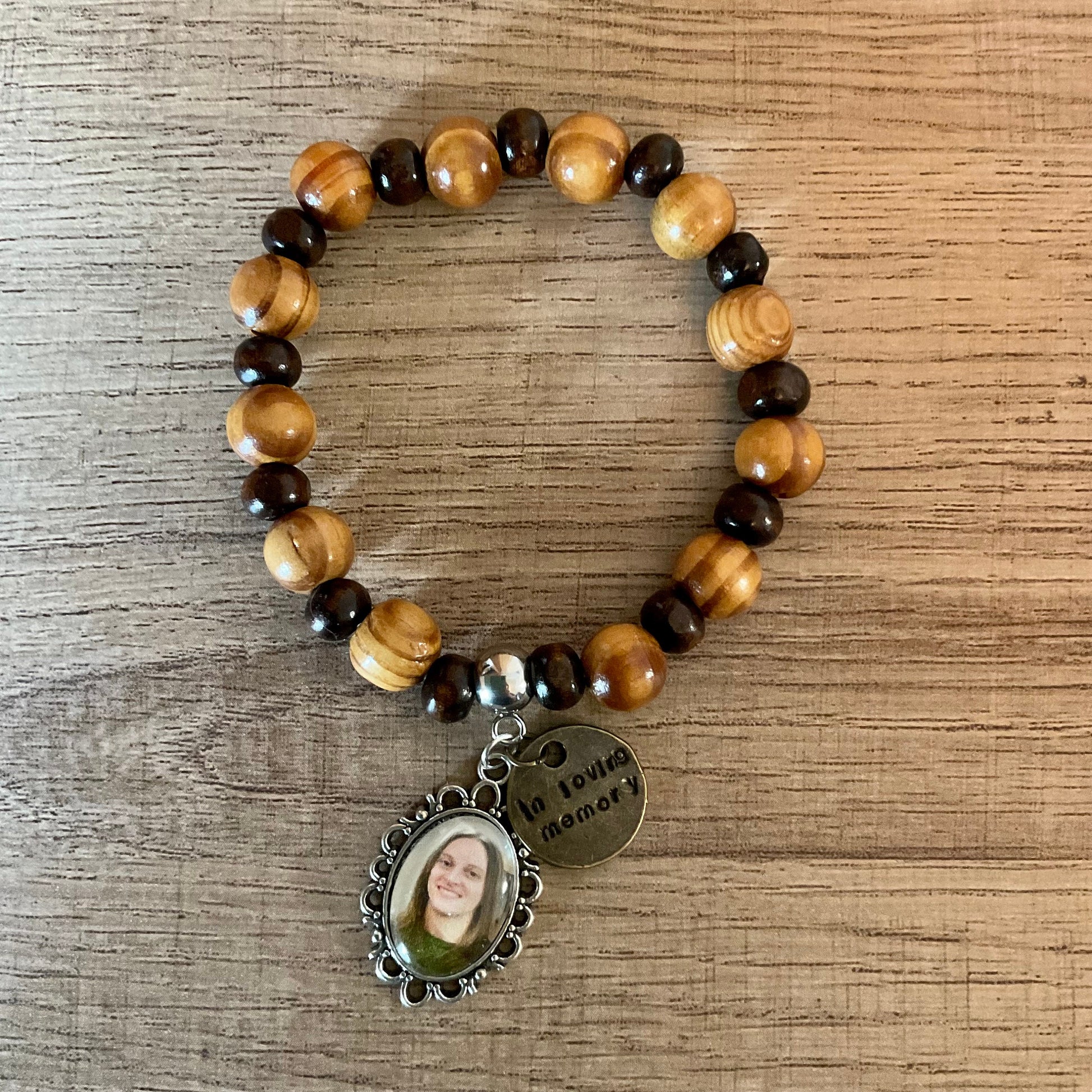 Personalized wood bead bracelet with photo charm. Keep your loved one close. Excellent gift for any occasion (funeral/sympathy, wedding, birthday, anniversary, graduation, etc.) for yourself or someone else! You can personalize it with a photo, design, or message of your choice.
